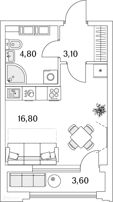 ✅ Просторная жилая площадь: 16.8 м².