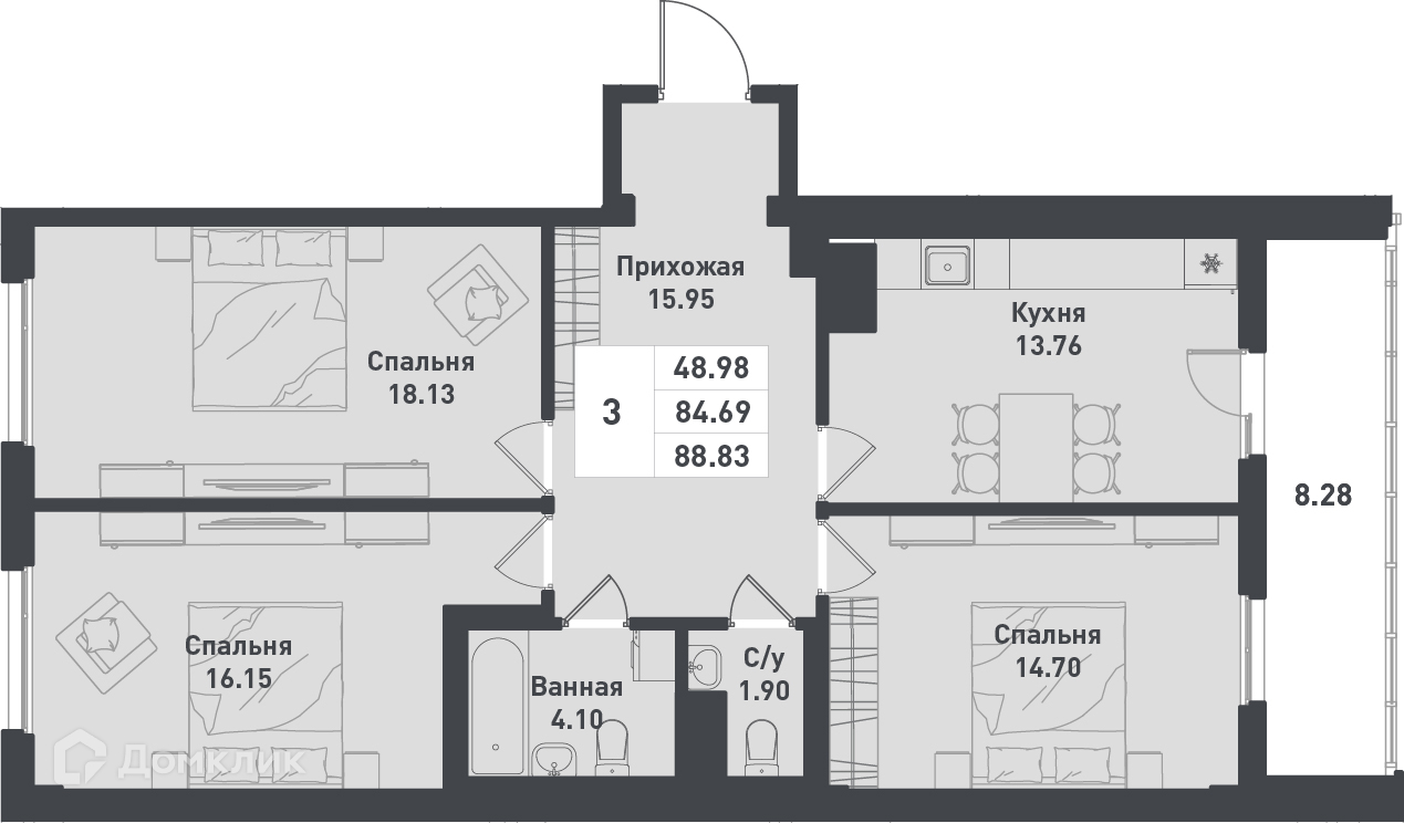 - ✅ Просторная жилая площадь: 85.6 м².