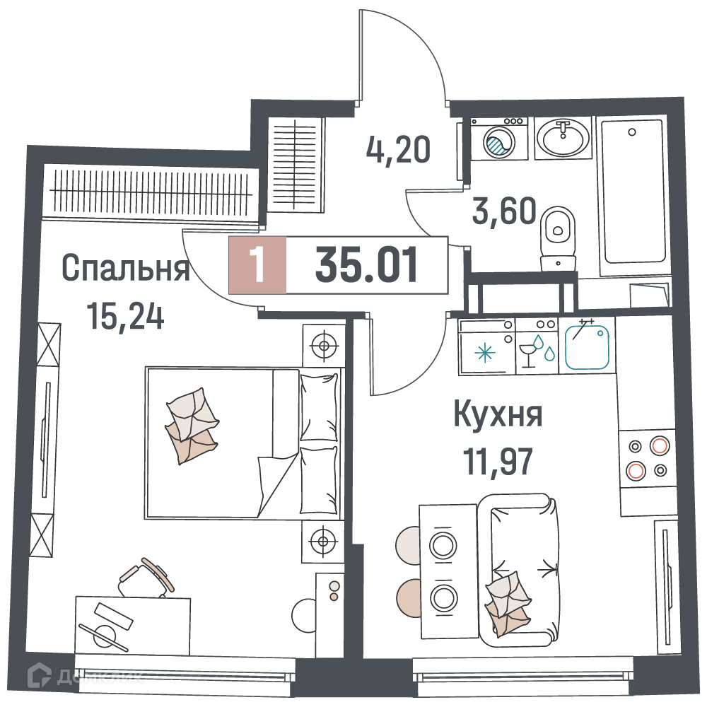 - Общая площадь: 35.01 м²