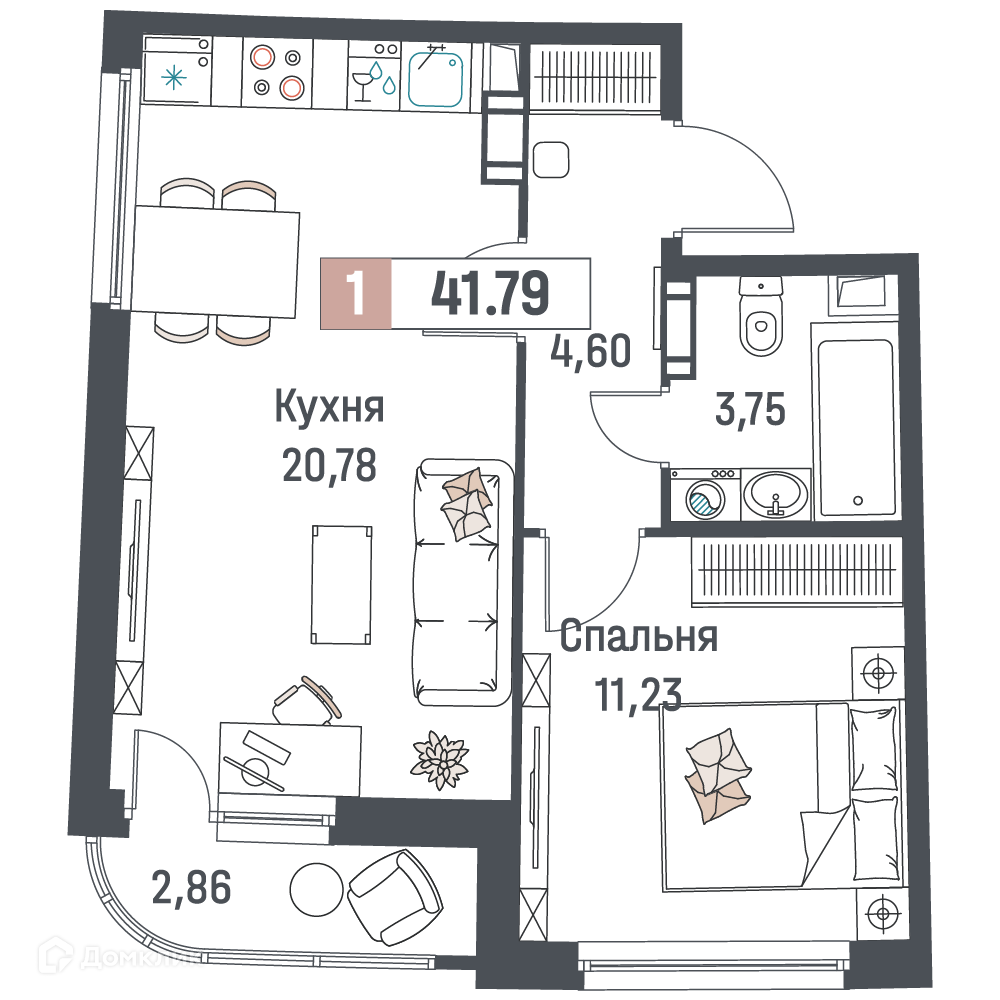 - Общая площадь: 41.79 м²