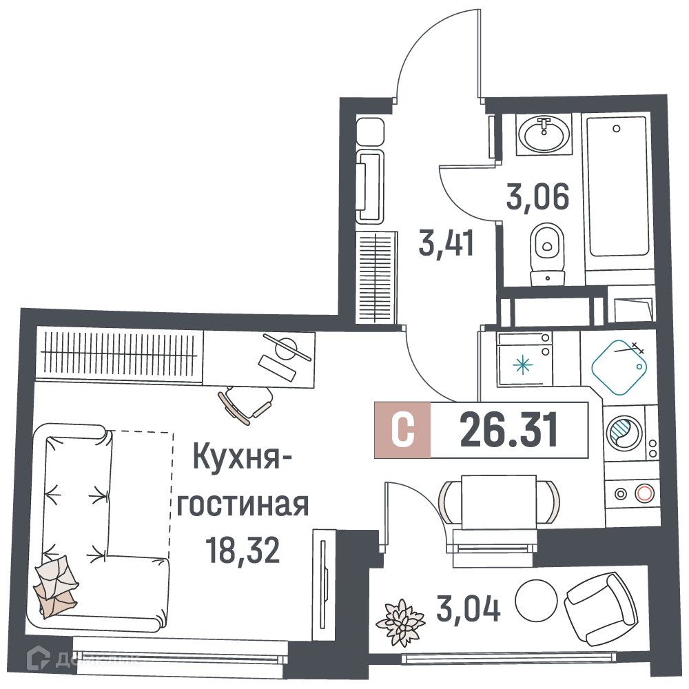 - Общая площадь: 26.31 м²