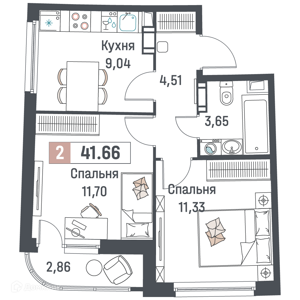 - Общая площадь: 41.66 м²