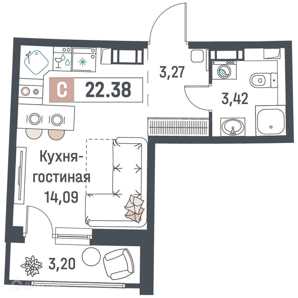 - Общая площадь: 22.38 м²