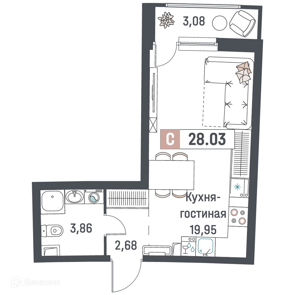 - ✅ Просторная жилая площадь: 19.95 м².