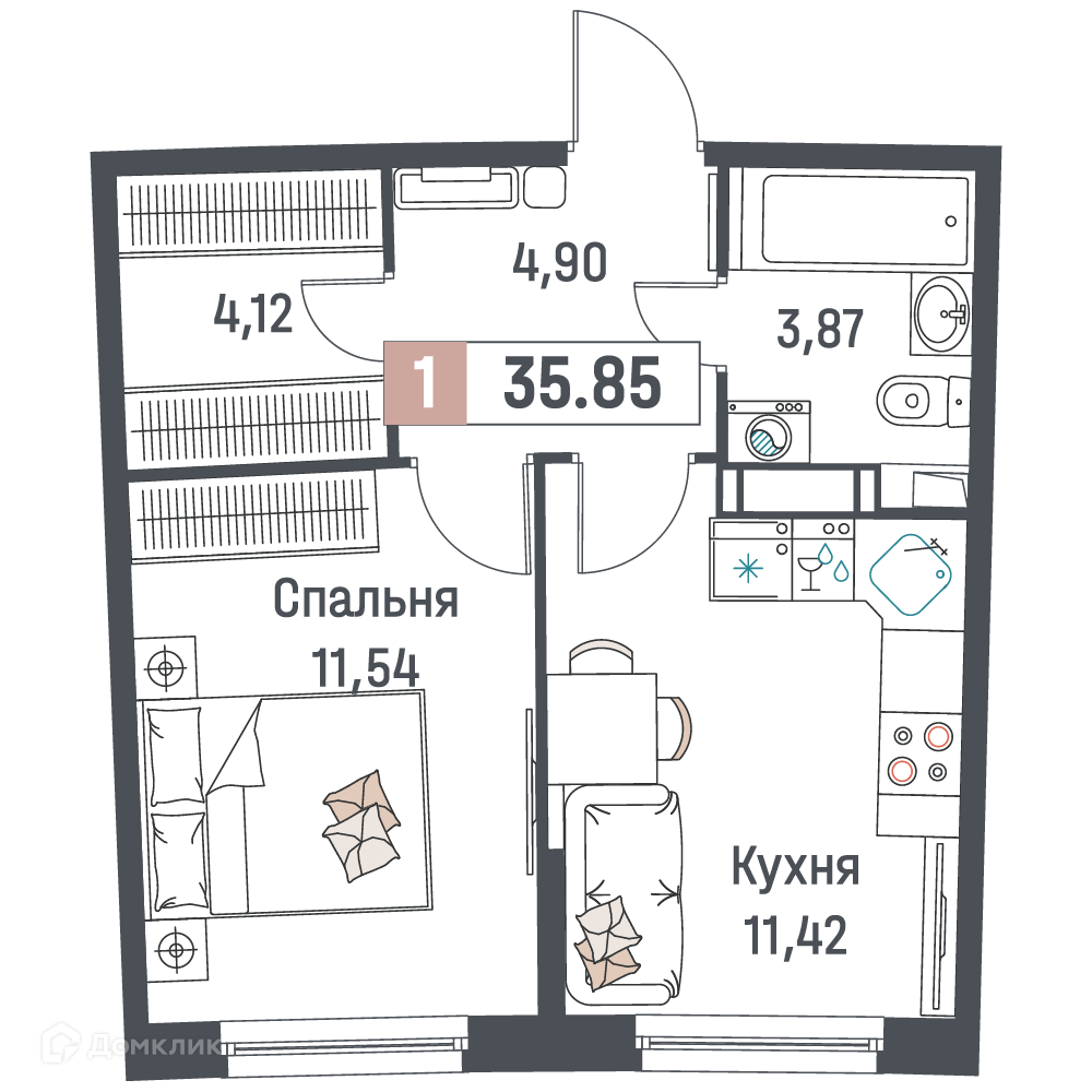 - Общая площадь: 35.85 м²