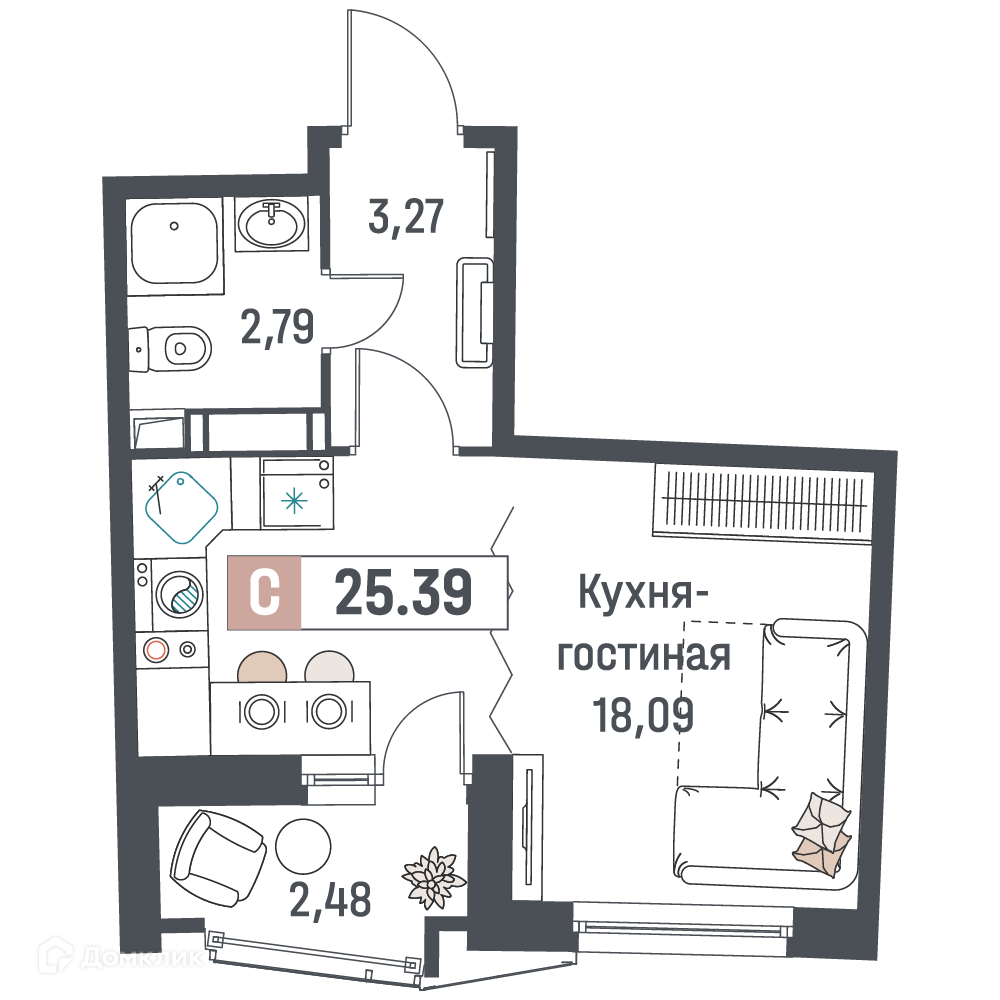 - Общая площадь: 25.39 м²