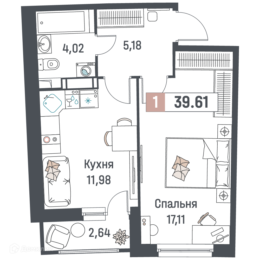 - Общая площадь: 39.61 м²