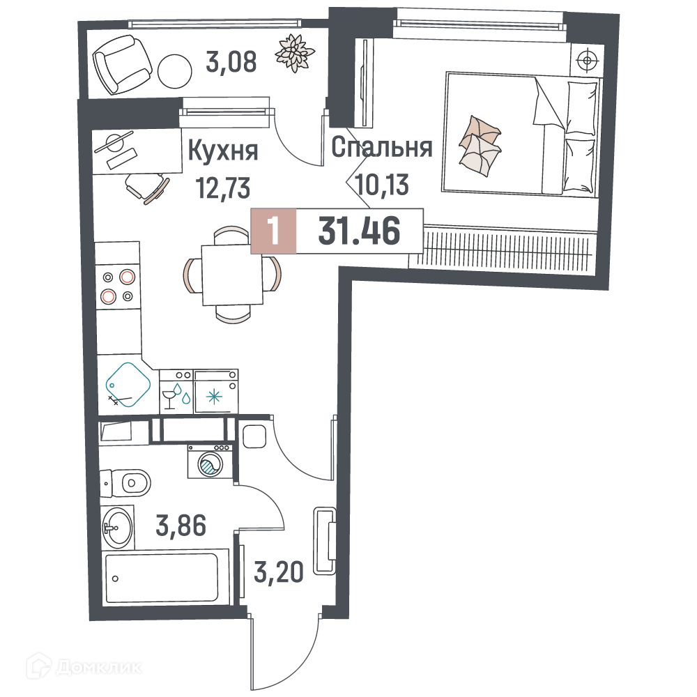 - Общая площадь: 31.46 м²