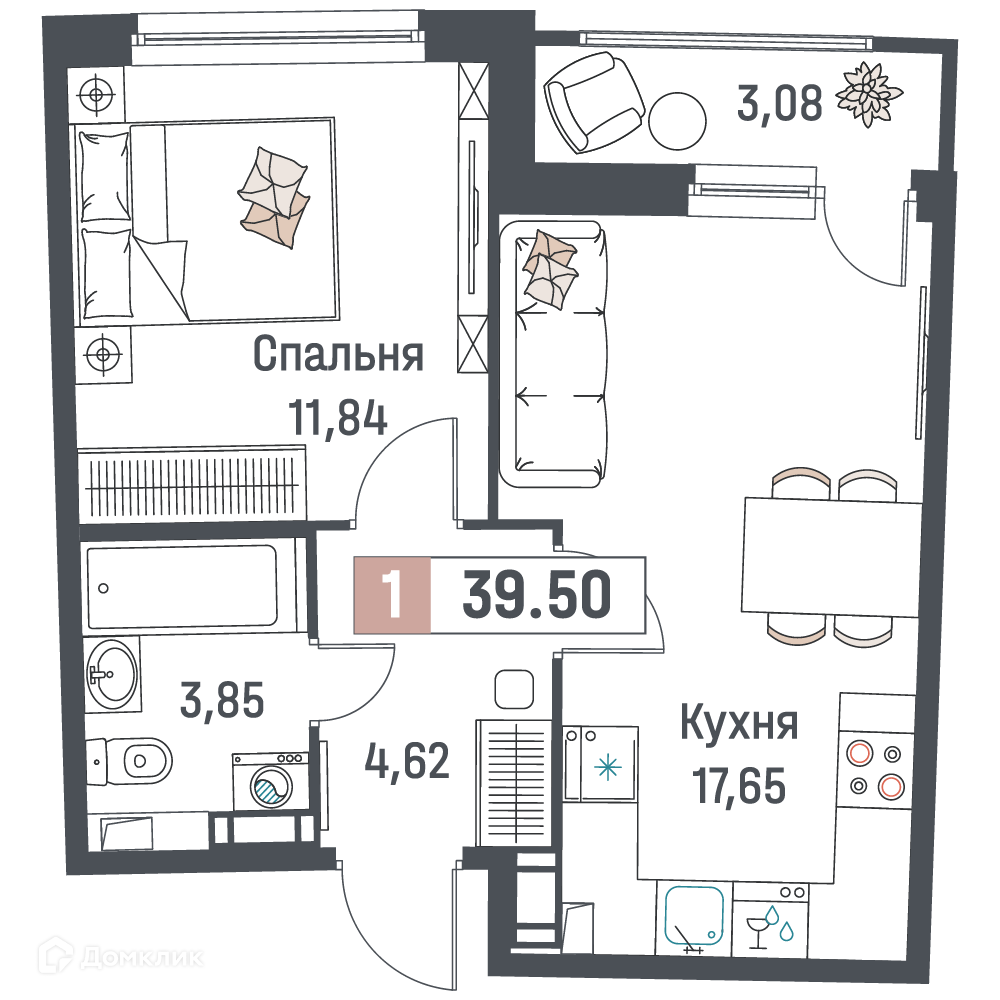- ✅ Общая площадь: 39.5 м².
