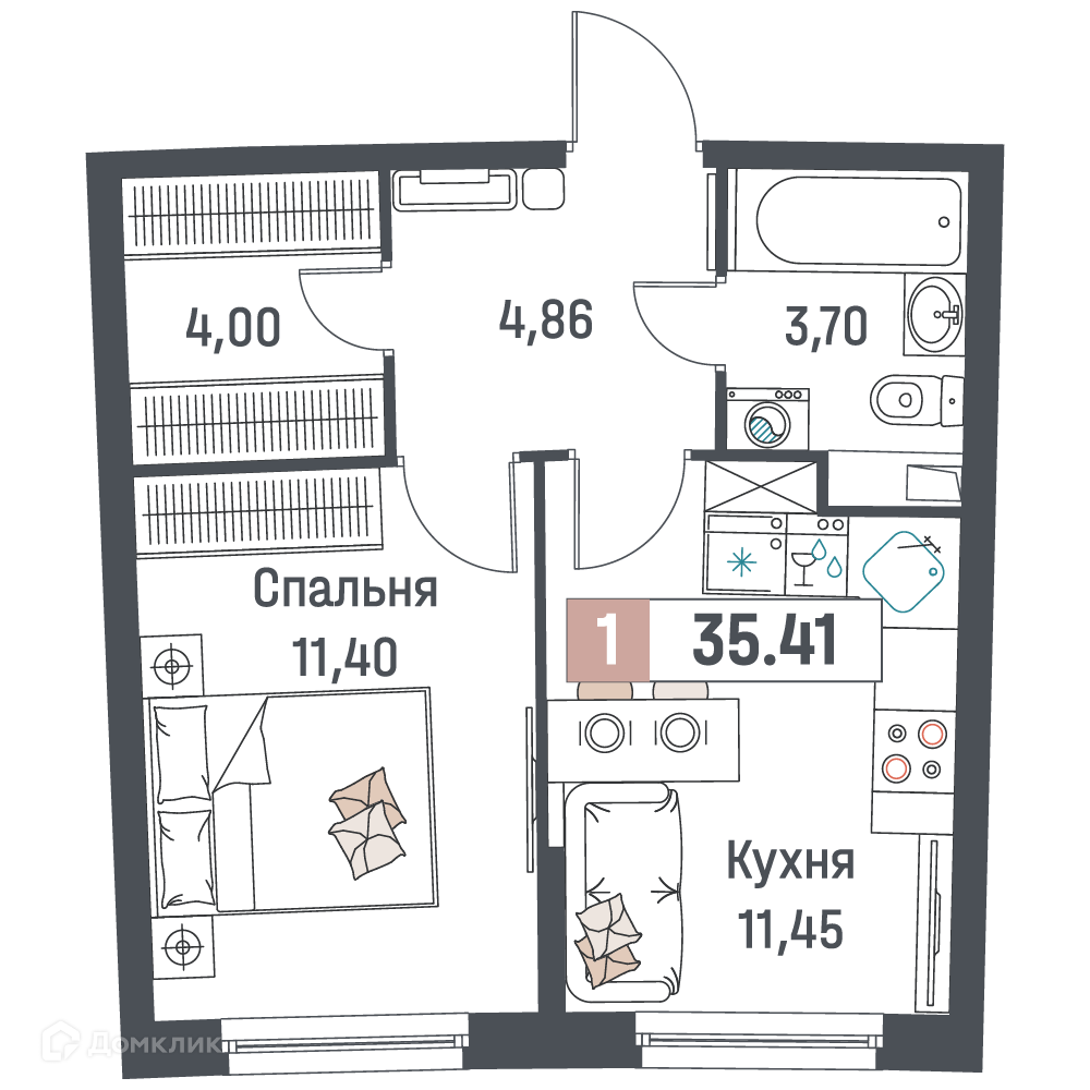 - Общая площадь: 35.41 м²