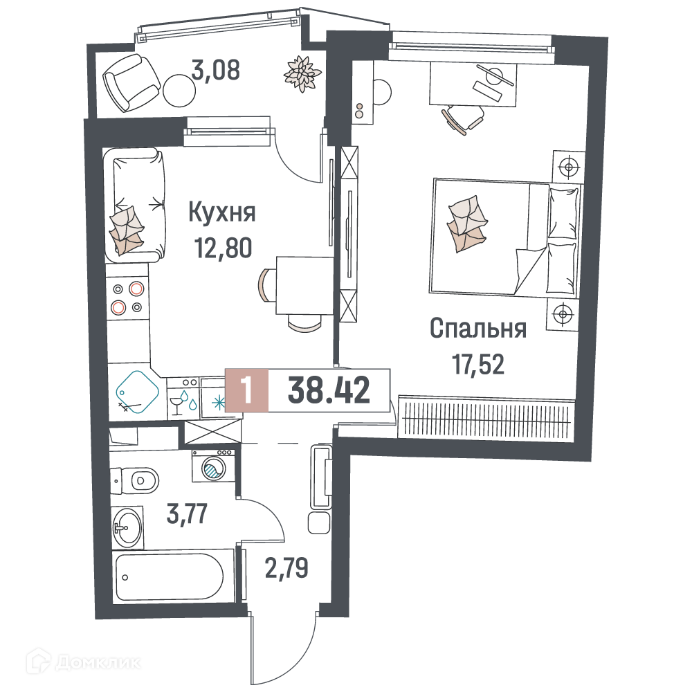 - Количество комнат: 1-комнатная квартира