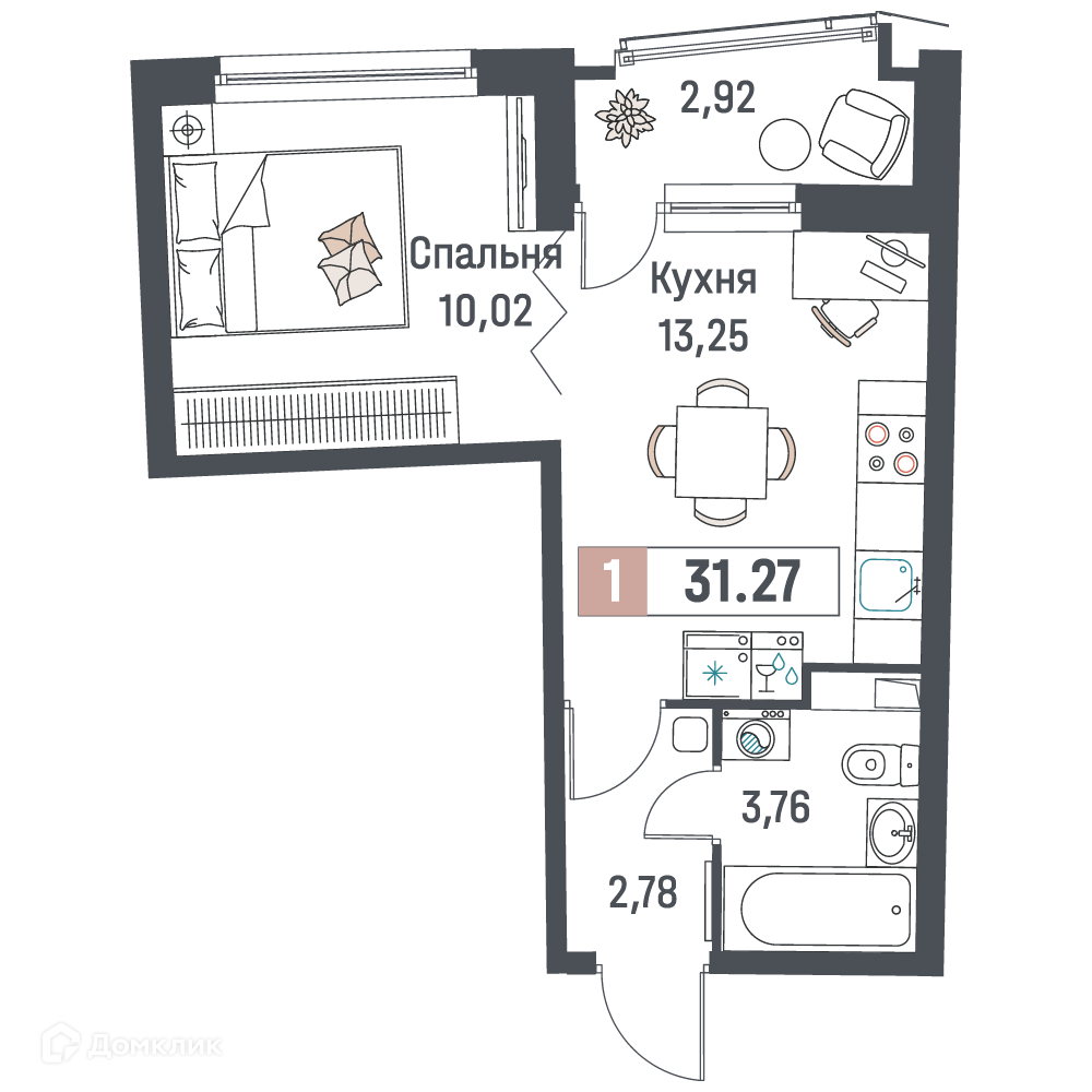 - Общая площадь: 31.27 м²