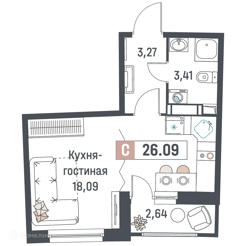 - Общая площадь: 26.09 м²