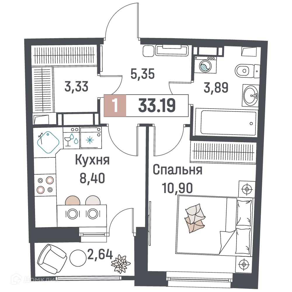 - Общая площадь: 33.19 м²