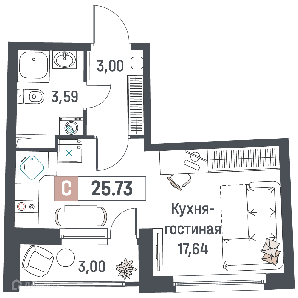 - Общая площадь: 25.73 м²