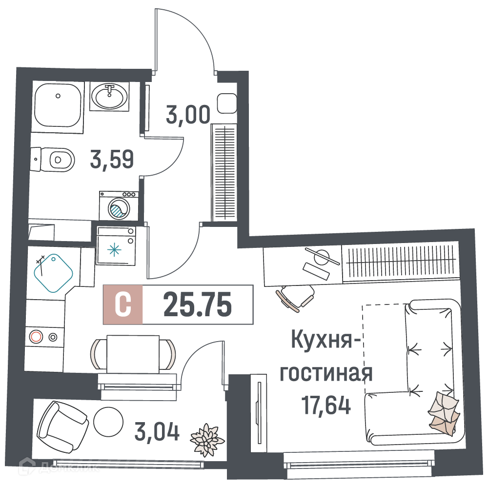 - Общая площадь: 25.75 м²