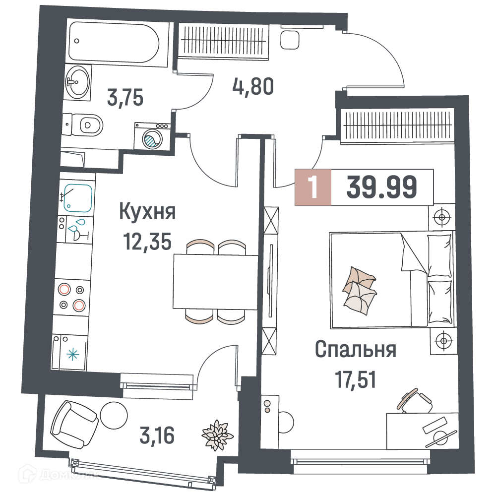 - Общая площадь: 39.99 м²