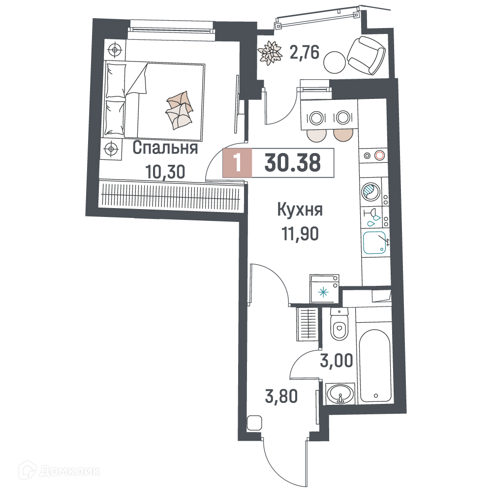 - Общая площадь: 30.38 м²