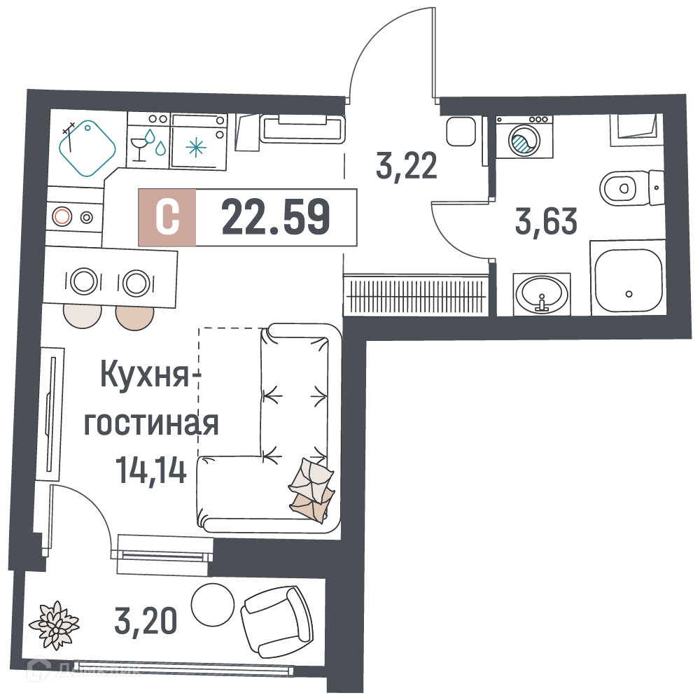 - Общая площадь: 22.59 м²