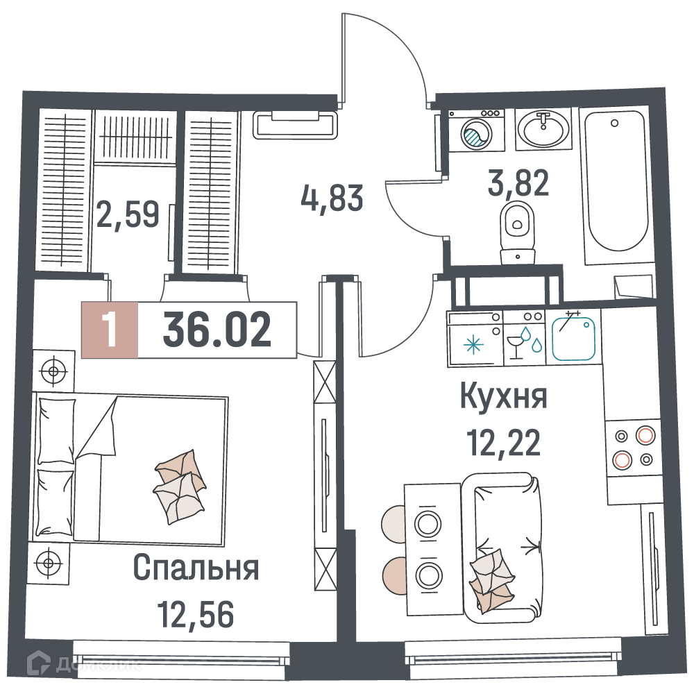 Планировка 1 комн. в ЖК "Авиатор"