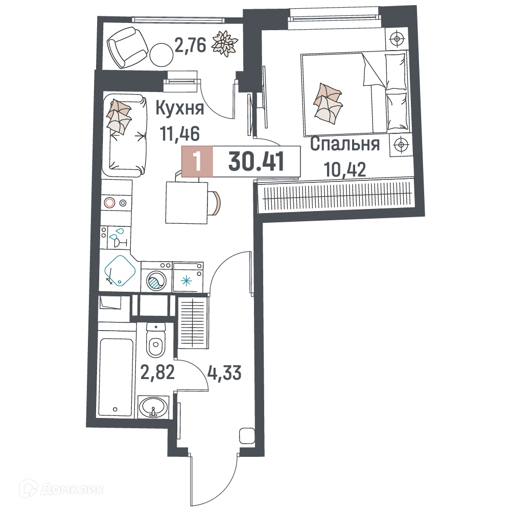 - Общая площадь: 30.41 м²
