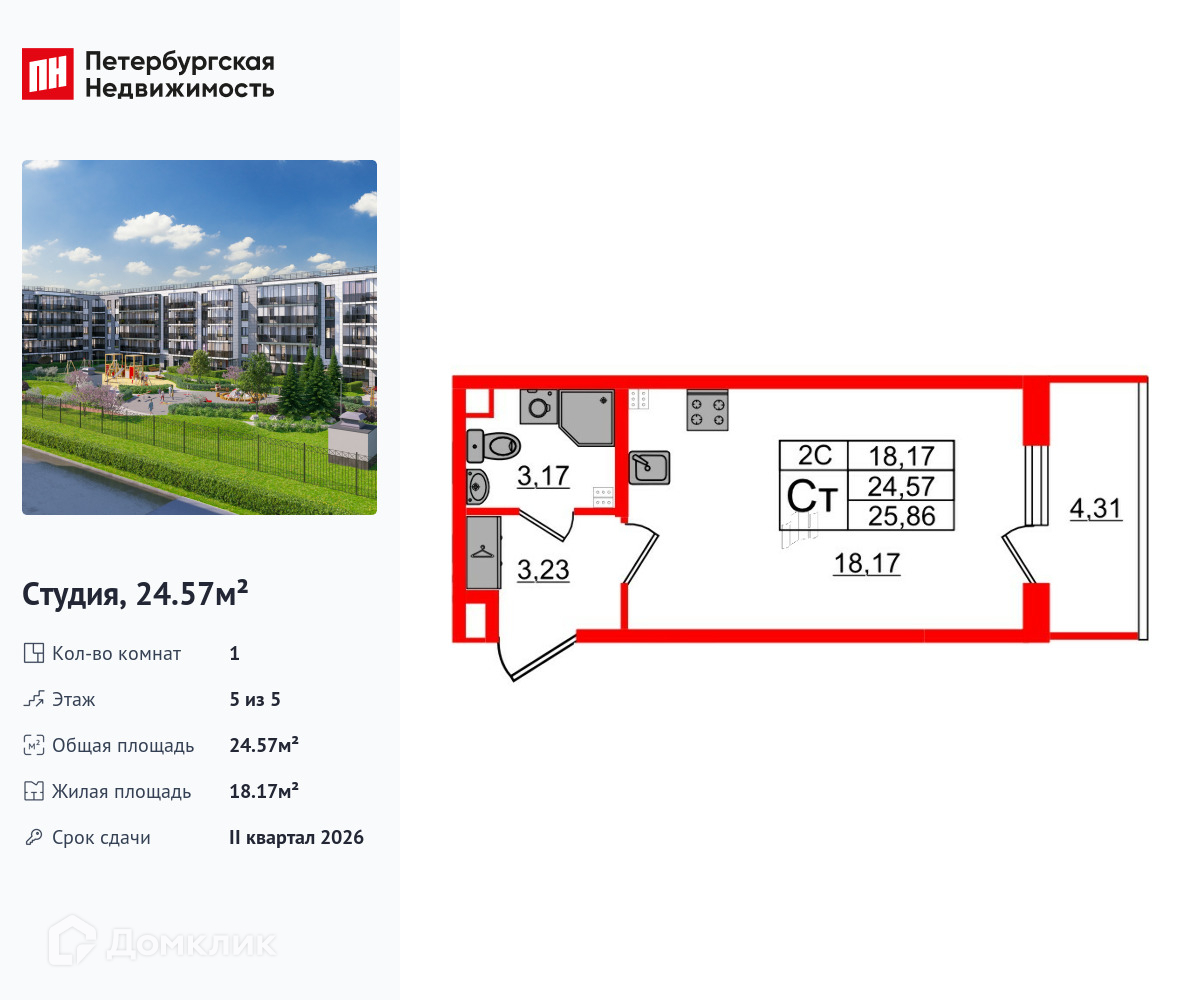 В продаже Студия в новом жилом комплексе "ЖК Парадный ансамбль" 🏢