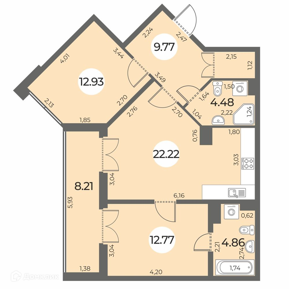 ✅ Кухня: 22.22 м² — место для кулинарных шедевров.