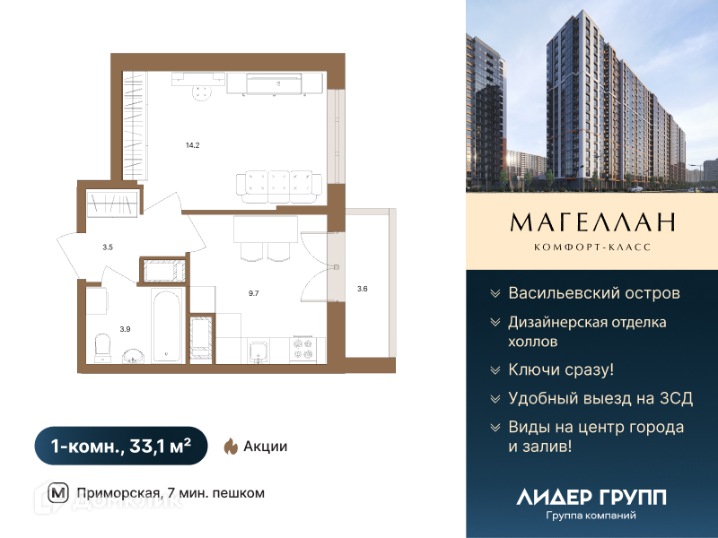 Комплекс расположен на намывных территориях Васильевского острова, на берегу Финского залива, в самом сердце Петербурга.В «Магеллан» предлагает на выбор компактные квартиры разных конфигураций и размеров: от студий до двухкомнатных.
