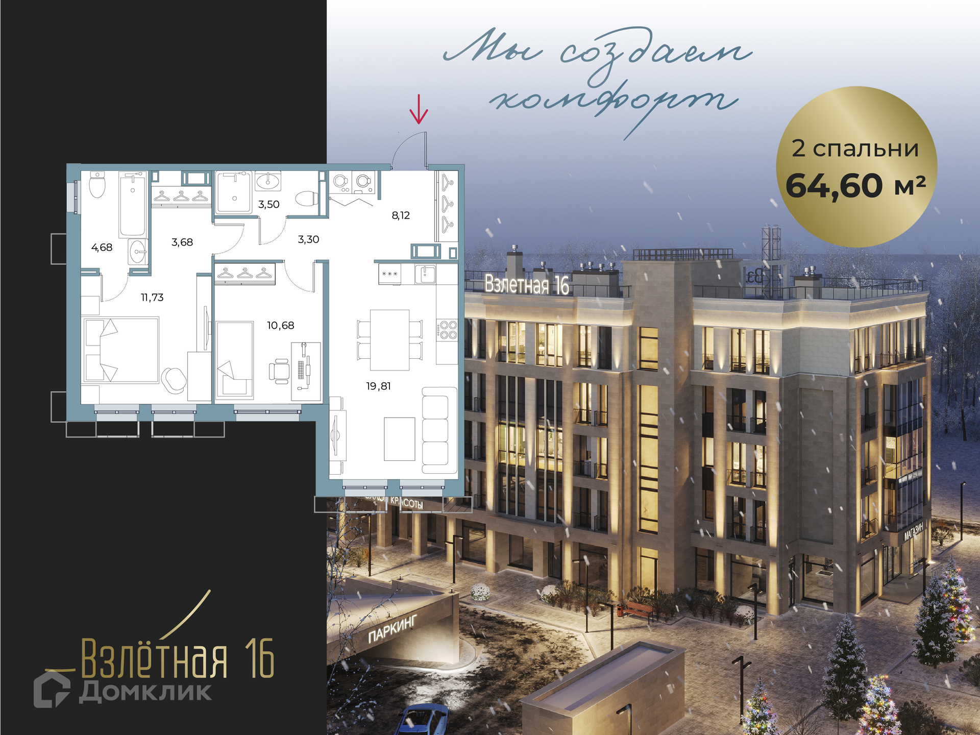 Новый ЖК «Взлетная 16», камерный малоэтажный дом на 68 квартир. Дом состоит из трех 5-этажных секций. Комплекс является уникальным за счет небольшого количества квартир с большим выбором продуманных планировочных решений. Важной особенностью жилого комплекса является наличие подземного паркинга на 42 парковочных места + гостевая парковка, закрытый и безопасный внутренний двор, колясочные и велосипедные в парадных, 30 кладовых помещения в подземном паркинге, как дополнительное место хранения сезонных вещей. ЖК «Взлетная 16» - идеальное пространство для спокойной семейной жизни в созвучии с динамикой городского комфорта. Строгость линий, многоплановость фасадов, внимание к деталям — вот что лежит в основе подхода к архитектурным решениям, объединяющим привычную классику и актуальность.