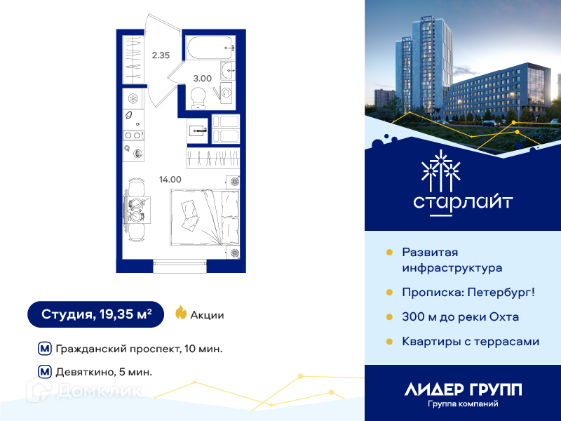 Жилой комплекс комфорт-класса «Старлайт» возводится в Красногвардейском районе Санкт-Петербурга в 300 метрах от берега реки Охта у Новоохтинского парка. Это зеленый активно развивающийся и благоустраиваемый квартал Петербурга, где природный ландшафт идеально сочетается с хорошей транспортной доступностью и развитой, сложившейся инфраструктурой. Проект состоит из двух устремленных ввысь 25-этажных современных башен и 7-ми этажного корпуса переменной этажности с индивидуальными террасами. Жилые корпуса объединены галереей-стилобатом, в которой будут располагаться магазины, пекарни, аптеки и салоны красоты - все, что необходимо современному петербуржцу. В радиусе 1,7 км от дома находятся 2 станции метро «Гражданский проспект» и «Девяткино», ж/д станция «Новая охта».