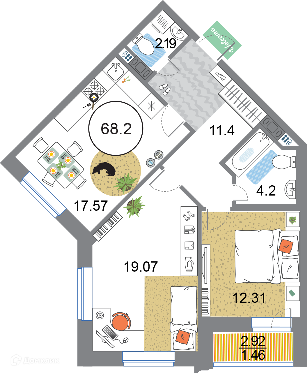 ✅ Кухня: 17.57 м² — эргономичное пространство.