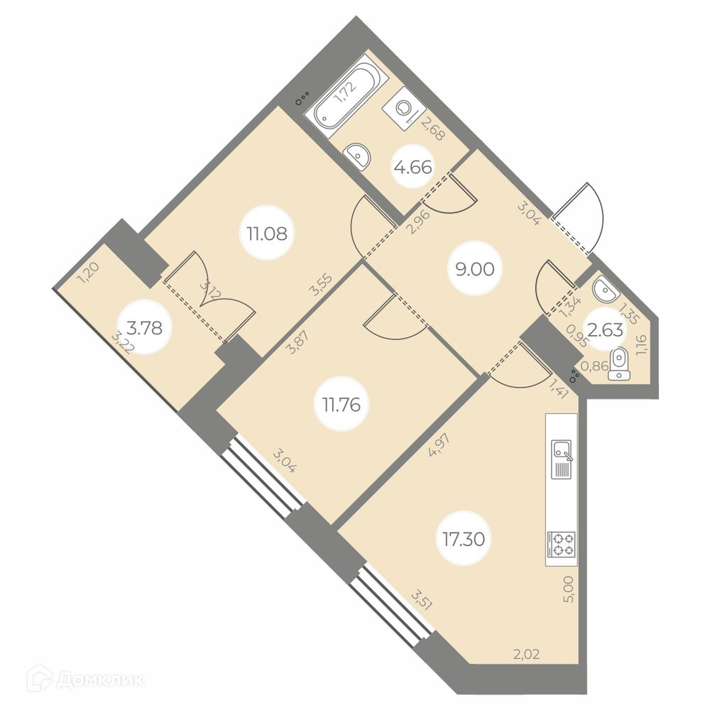 ✅ Кухня: 17.34 м² — эргономичное пространство.