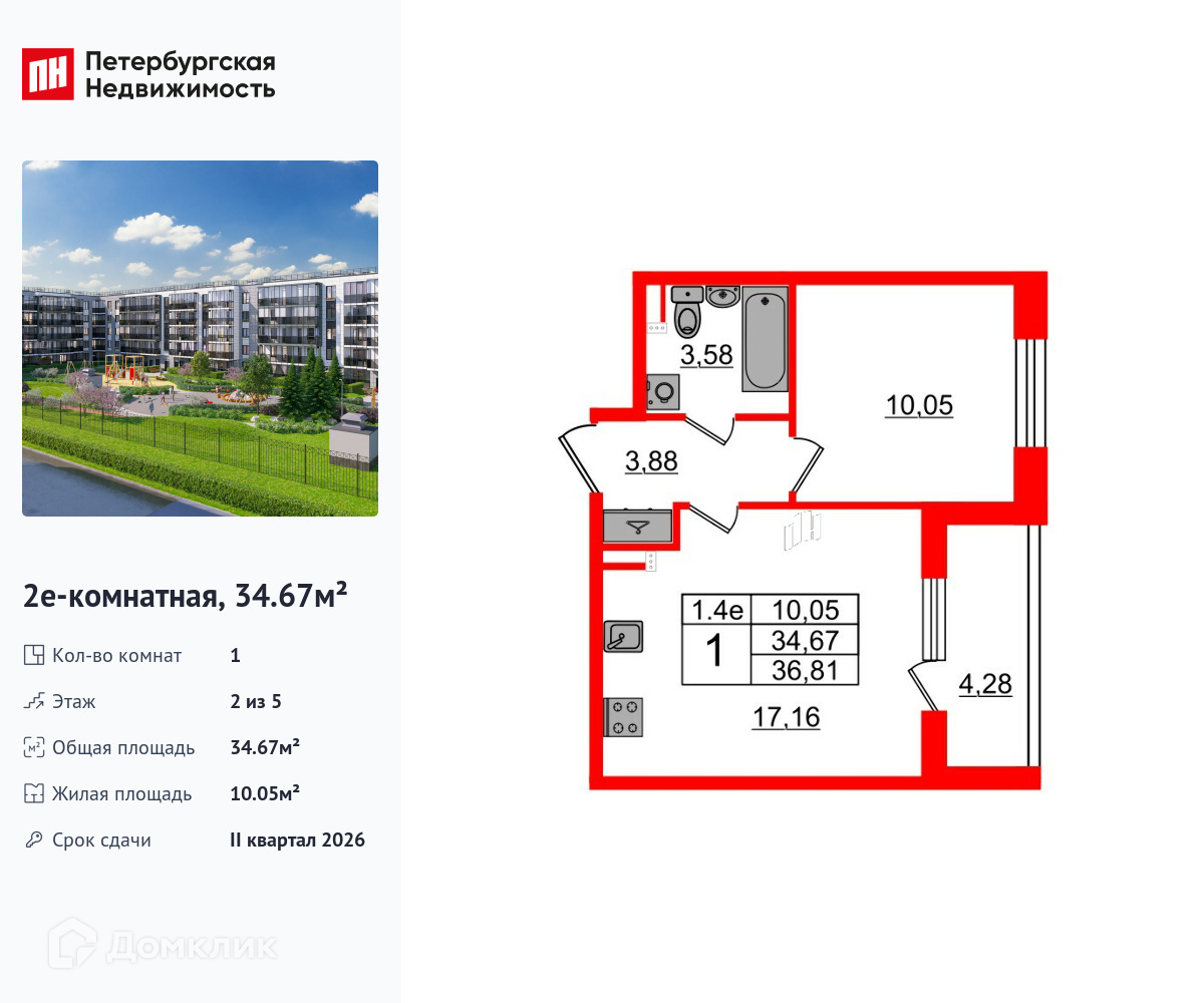 В продаже 1-комнатная квартира в новом жилом комплексе "ЖК Парадный ансамбль" 🏢
