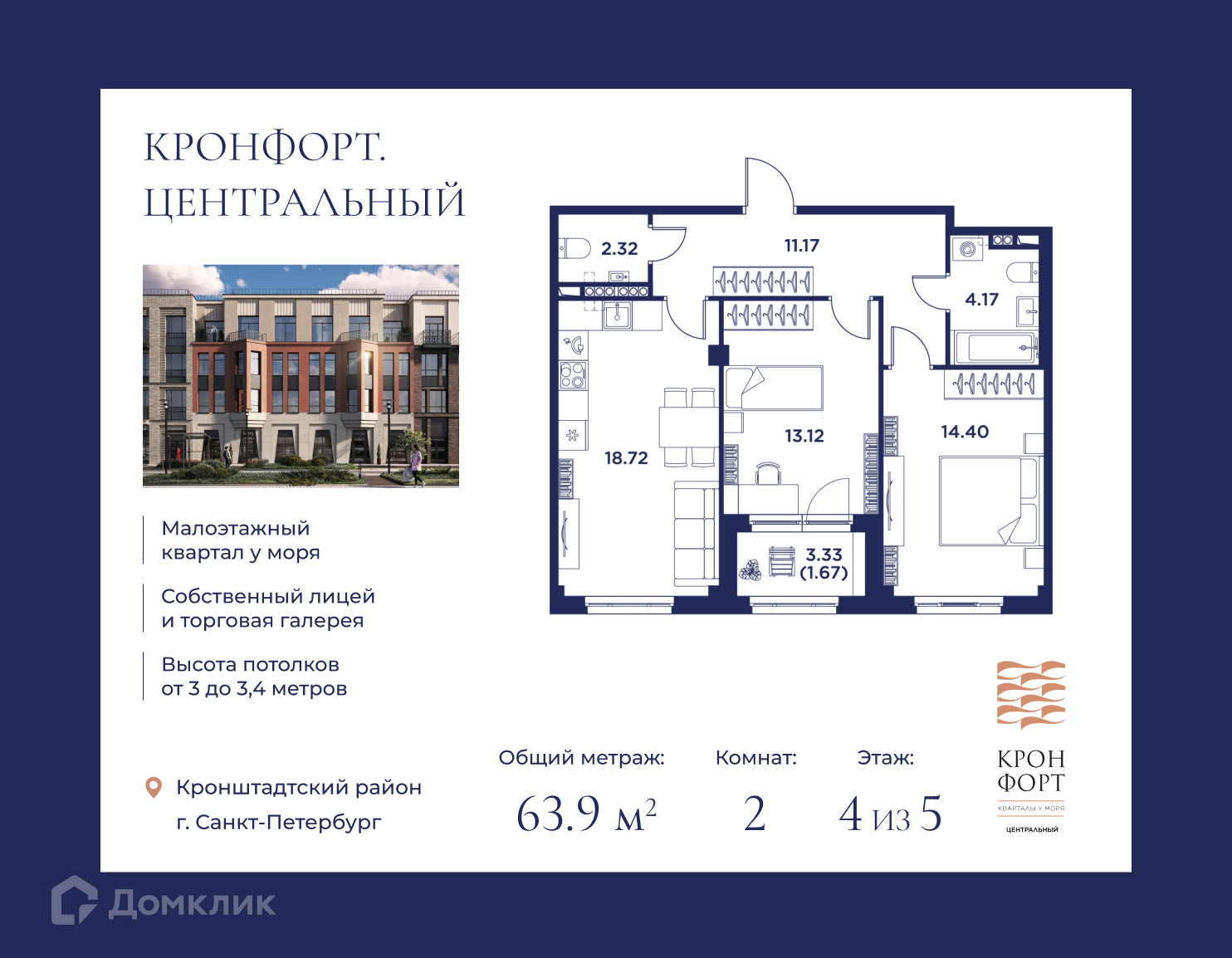 О жилом квартале ЖК «Кронфорт.Центральный» — это малоэтажный квартал, формирующий образ жизни на морском побережье в окружении уникальной архитектуры и современных инфраструктурных решений для жизни и досуга. Корпуса квартала образуют закрытые дворы с детскими площадками и обустроенными зонами отдыха, доступными только для жителей комплекса. «Кронфорт» — часть кластера «Остров фортов», реализуемого по поручению президента России с 2019 г. В рамках проекта создается комплекс многофункциональных общественных пространств: социальные, коммерческие, культурные и досуговые объекты, которые обеспечат высокий уровень качества городской среды, откроют новые возможности для жителей и туристов. Расположение и транспортная доступность • Сестрорецк и Курортный район: 25 минут на автомобиле. • «Лахта Центр»: 30 минут на автомобиле. • Аэропорт «Пулково»: 50 минут на автомобиле. • Московский вокзал: 60 минут на автомобиле. • «Метеор»: 60 минут до Эрмитажа. Кронштадт связан с городом автобусными маршрутами. Общественный транспорт курсирует между городом и станциями метро «Старая Деревня», «Беговая» и «Проспект Просвещения», а также до центра города. Инфраструктура На территории квартала «Кронфорт.Центральный» будут доступны: • Детский сад на 150 мест с бассейном • Лицей на 550 учеников с залом-атриумом, двумя бассейнами и террасами • Кабинет врача на 80 посещений в смену. • Мультиформатный стрит-ритейл с досуговой инфраструктурой и полезными сервисами для резидентов на первых этажах. Благоустройство и места общего пользования: • Закрытые охраняемые дворы с контролем доступа и круглосуточным видеонаблюдением. • Концептуальное благоустройство дворов в двух стилях: «Архипелаг» и «Форум» с амфитеатром, пространствами для детей, спорта и отдыха. Для комфортной работы за ноутбуком на свежем воздухе предусмотрены «зеленые кабинеты». • Ландшафтный дизайн и арт-объекты гармонично дополняют архитектуру и создают особую атмосферу комфорта. • Предусмотрены подземный паркинг и кладовые. У парадных оборудованы велопарковки, внутри — колясочные. Инженерные и цифровые решения • Безопасность: доступ во двор, колясочные, секции, паркинг и кладовые по уникальному ID. • Видеонаблюдение всей территории комплекса через мобильное приложение. • Система «Умный дом»: - управление доступом во двор, парадные, паркинг, - доступ к камерам видеонаблюдения, - получение данных от приборов учета, - отправка заявок в управляющую компанию. О застройщике Компания «ГК Алькор» была основана в 2020 году с целью проектирования и строительства значимых объектов жилья и инфраструктуры. Улучшать условия жизни в городе и развивать его общественные пространства — главная задача компании. В команде девелопера – профессионалы рынка недвижимости с многолетним опытом работы в архитектурных бюро и строительных компаниях. Архитектура и планировки Малоэтажный квартал, формирующий образ жизни на морском побережье, в окружении актуальной архитектуры и современных инфраструктурных решений для жизни и досуга. Уникальные фасадные мотивы имеют разную цветовую гамму, отделку и фактуру. В работе над концепцией квартала принимала участие международная архитектурная компания Chapman Taylor. • Большой выбор планировочных решений от уютных студий до дизайнерских лофтов площадью до 13