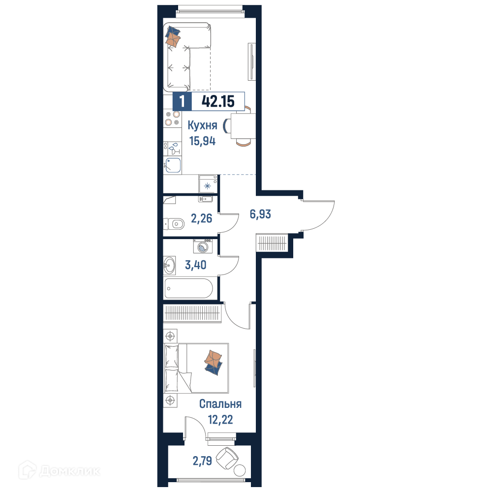 - Общая площадь: 42.15 м²