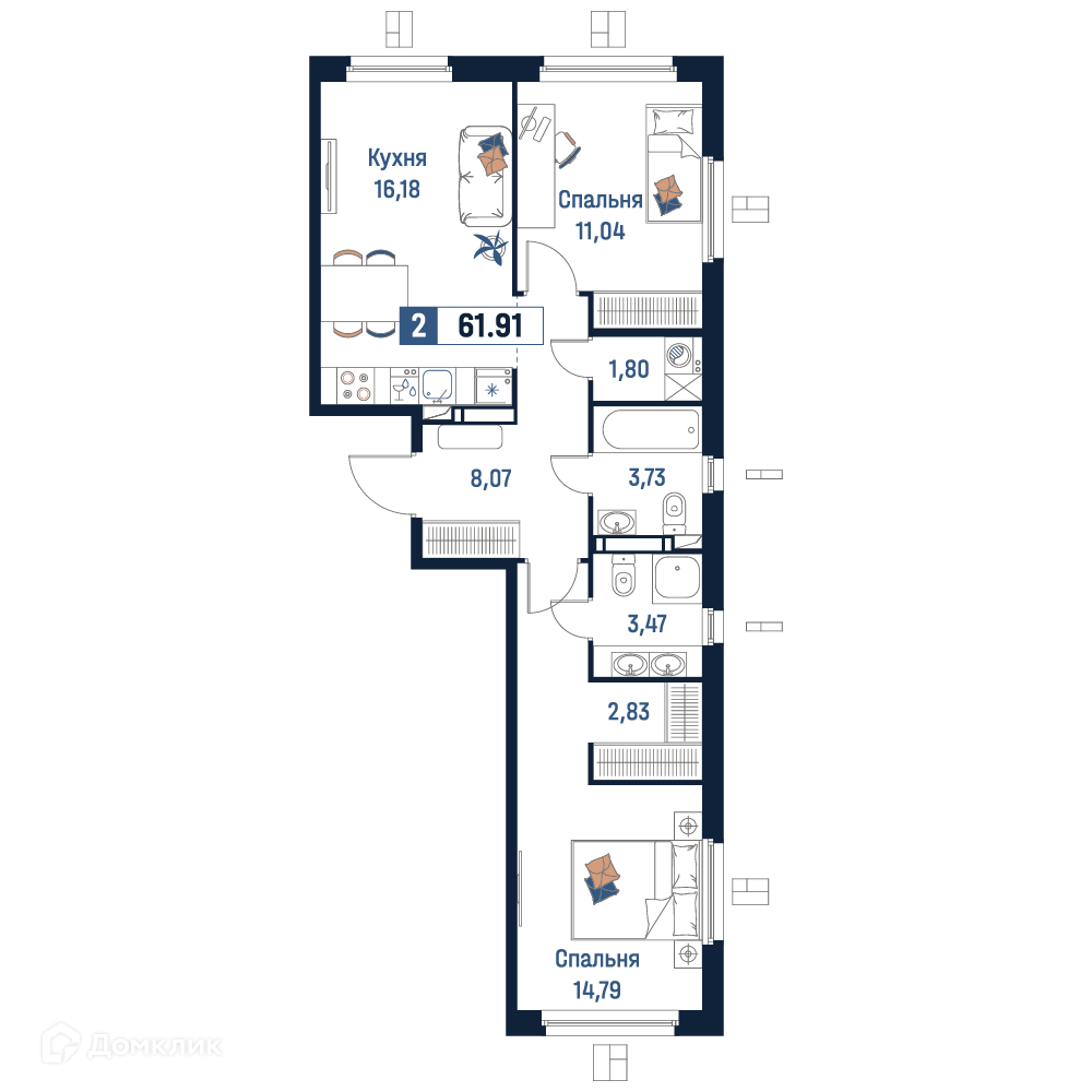 - Общая площадь: 61.91 м²