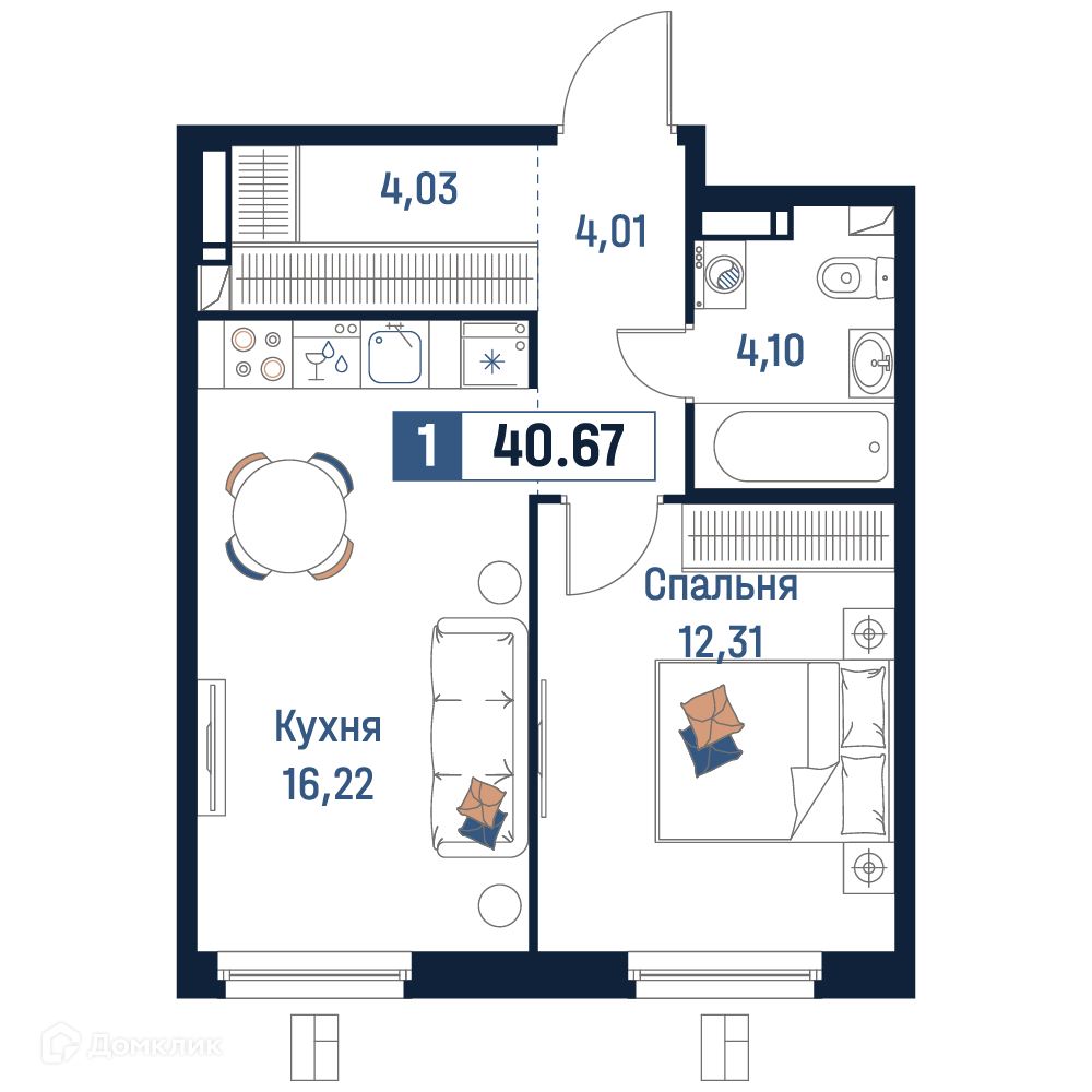 - Общая площадь: 40.67 м²