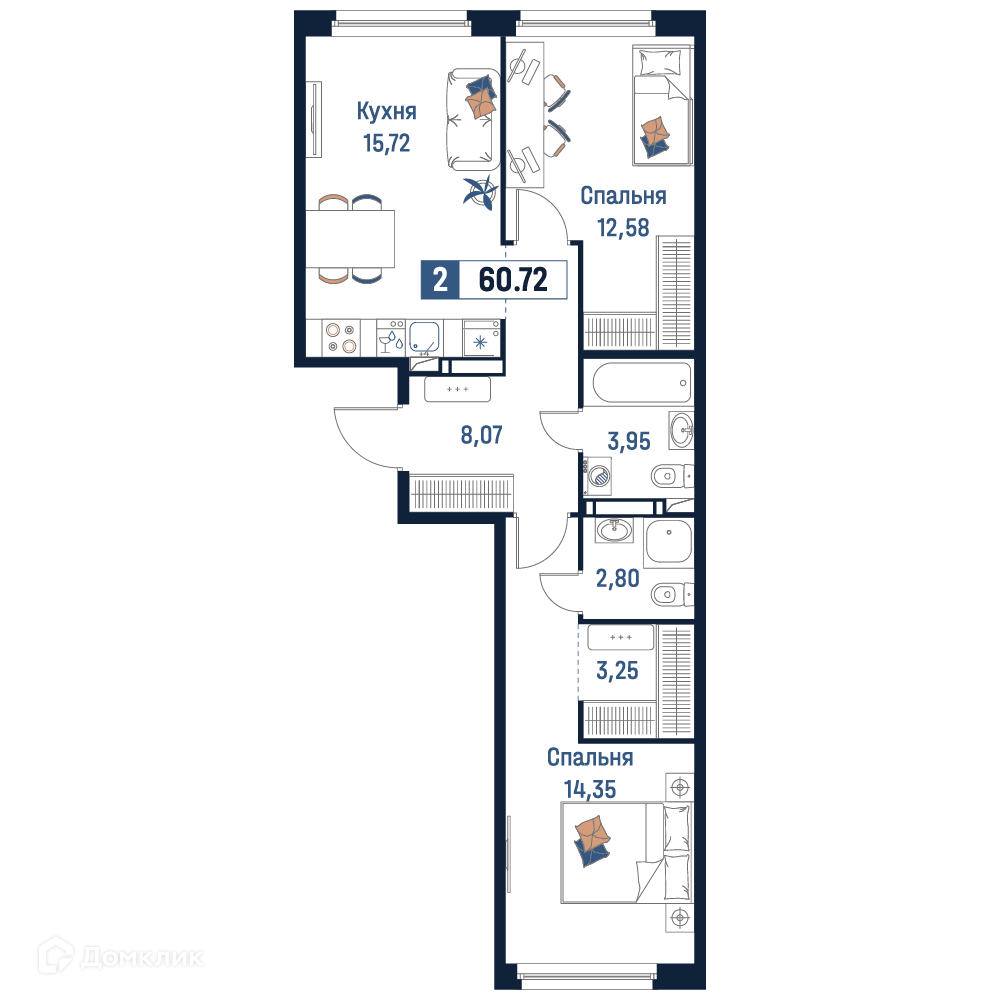 - Общая площадь: 60.72 м²