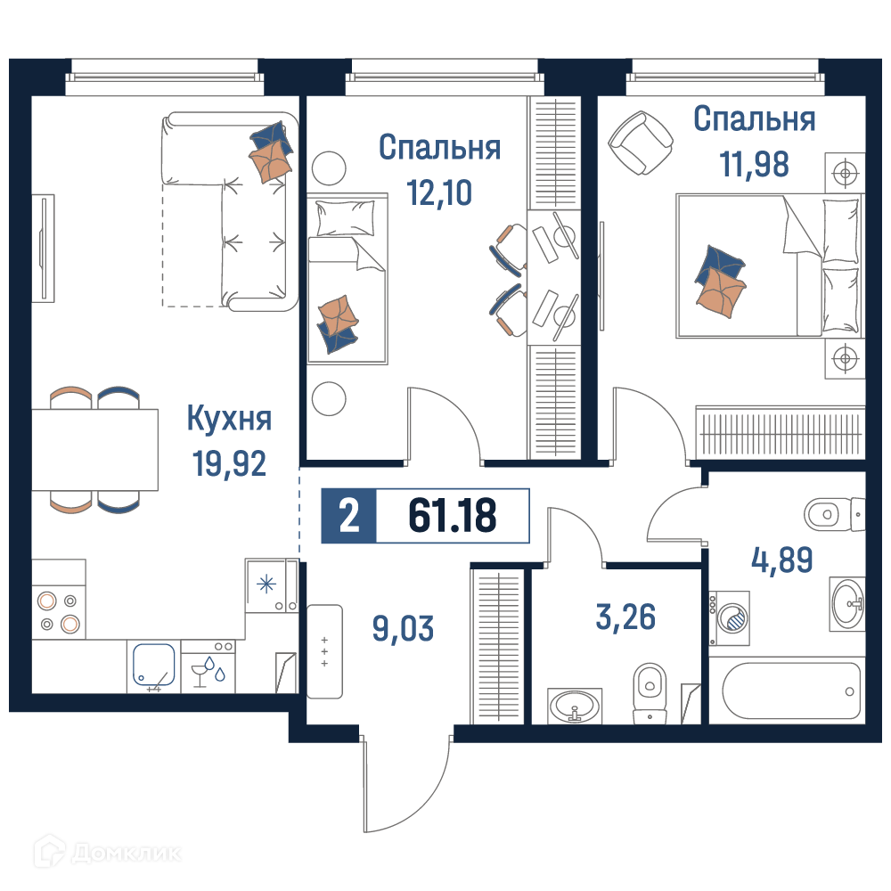 - Общая площадь: 61.18 м²