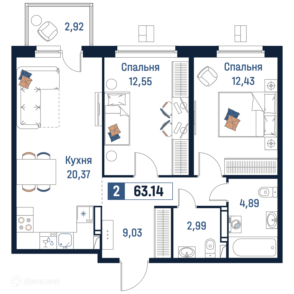 - Общая площадь: 63.14 м²