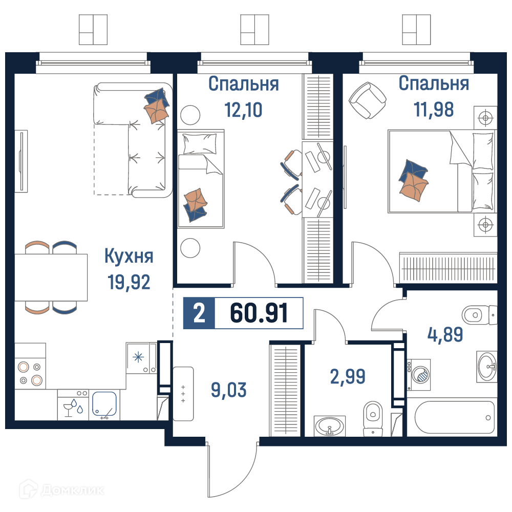 - Общая площадь: 60.91 м²