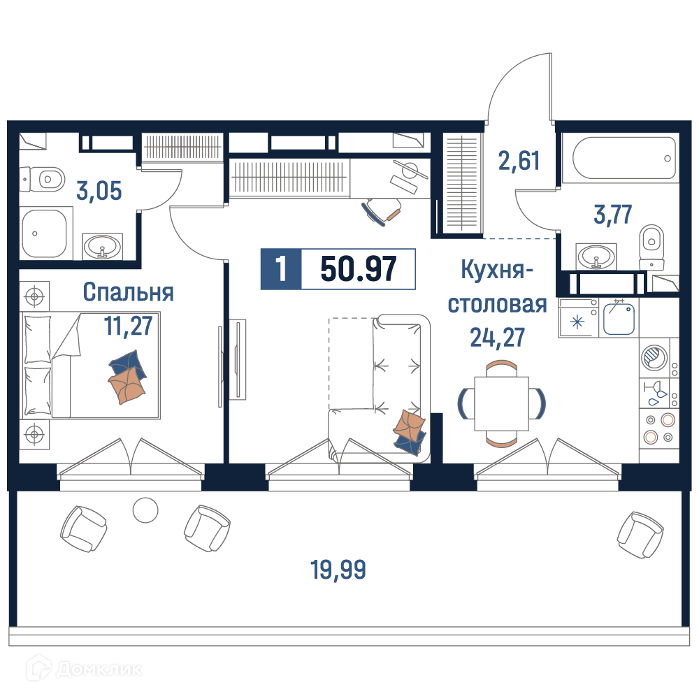 - Общая площадь: 50.97 м²