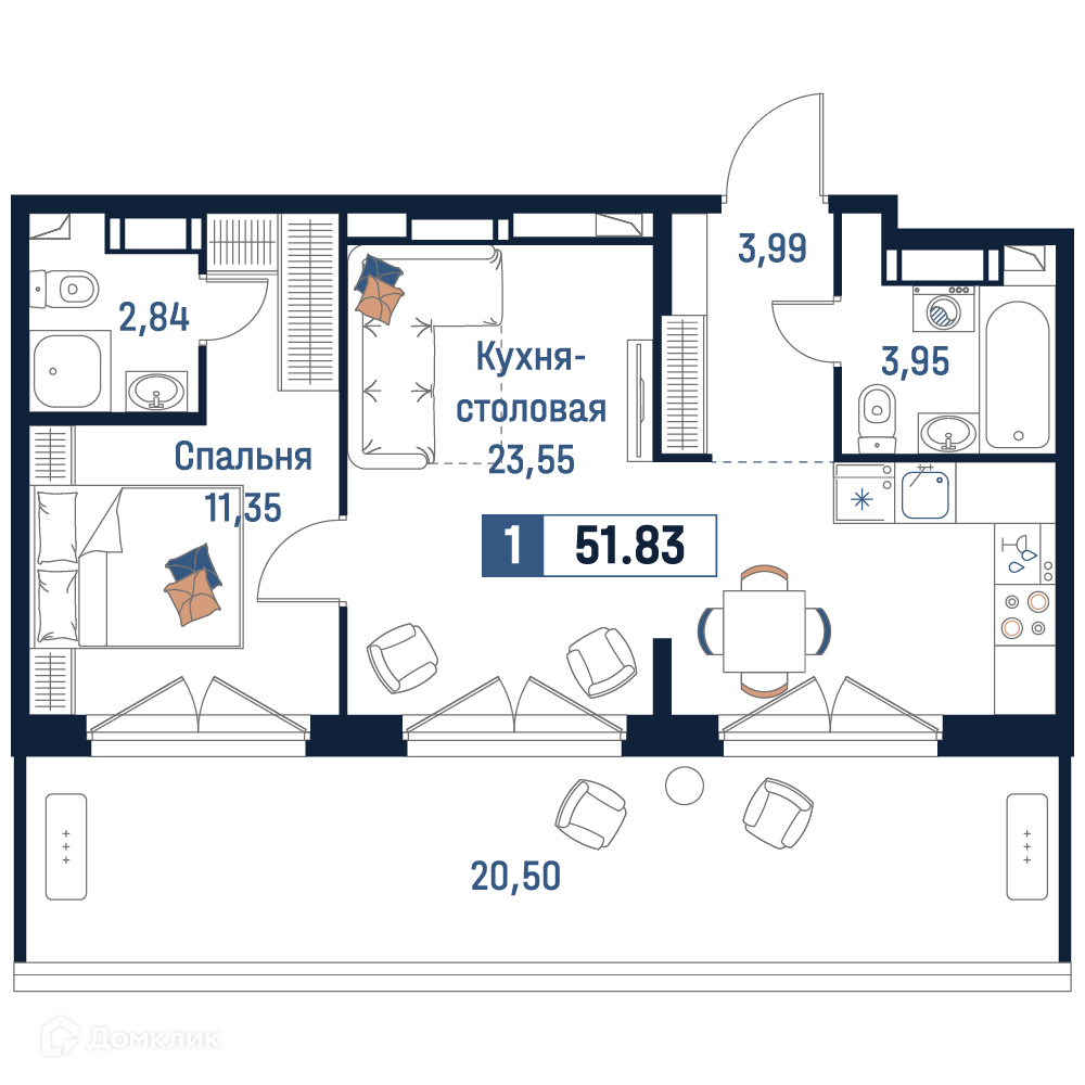 - Общая площадь: 51.83 м²