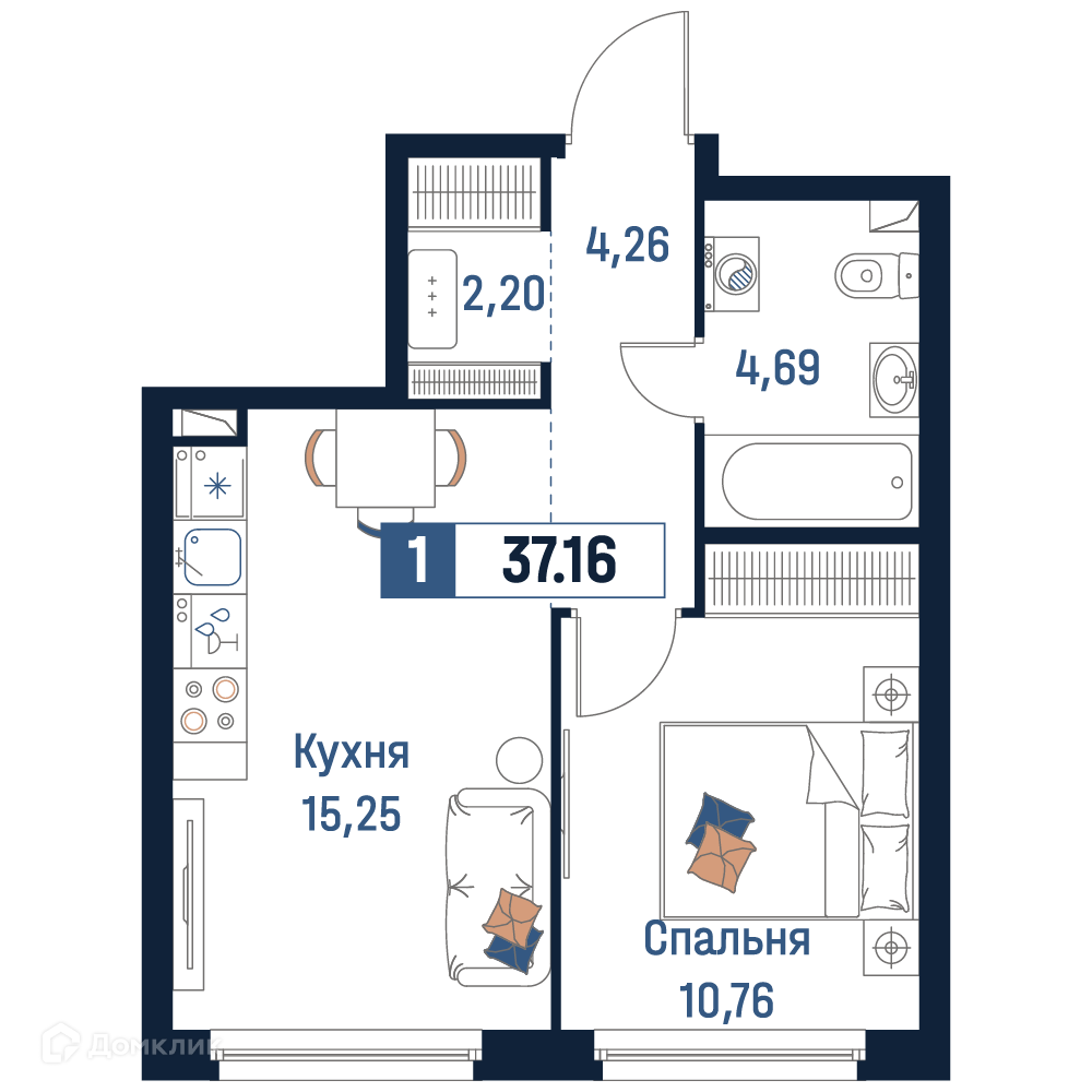 - Общая площадь: 37.16 м²