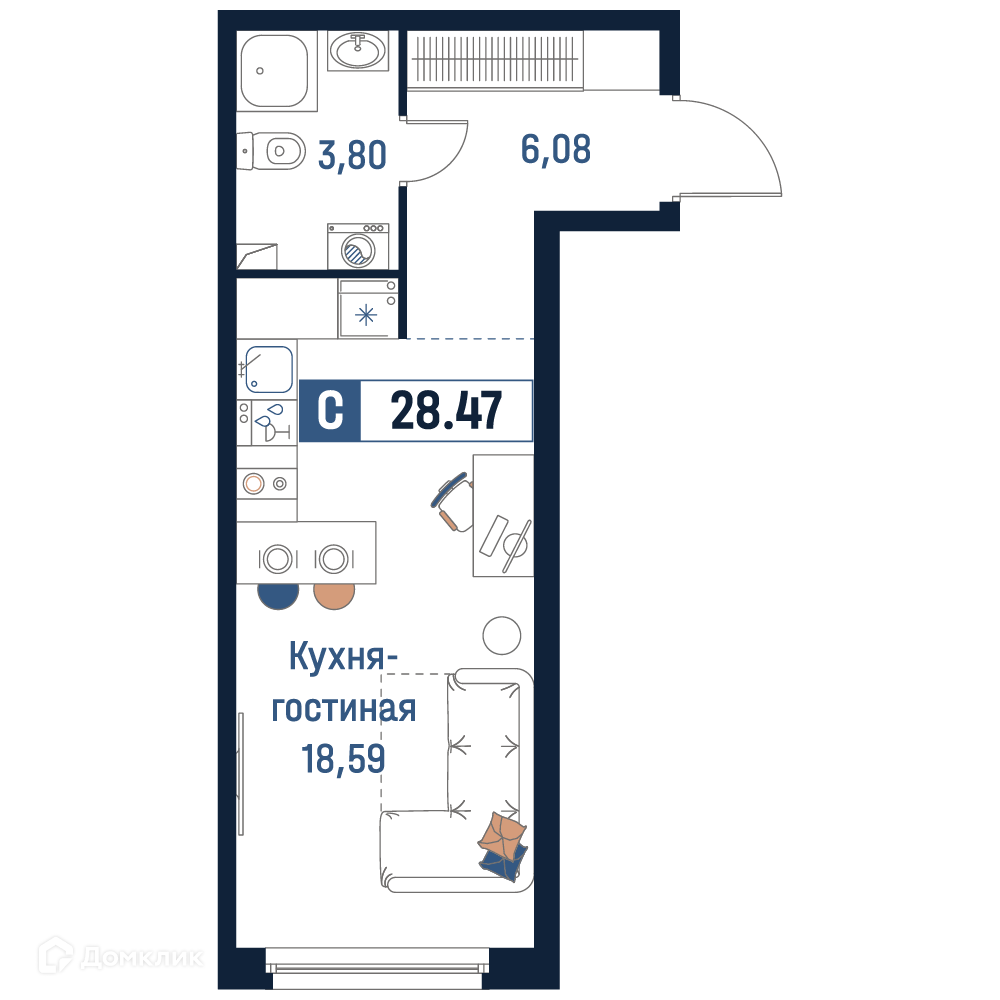 - Общая площадь: 28.47 м²