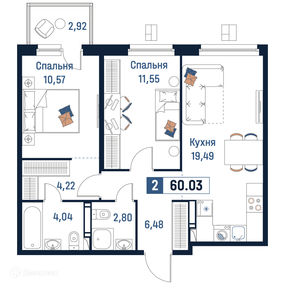 - Общая площадь: 60.03 м²