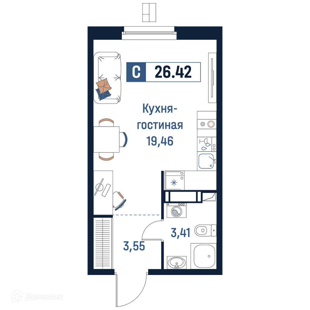 - Общая площадь: 26.42 м²