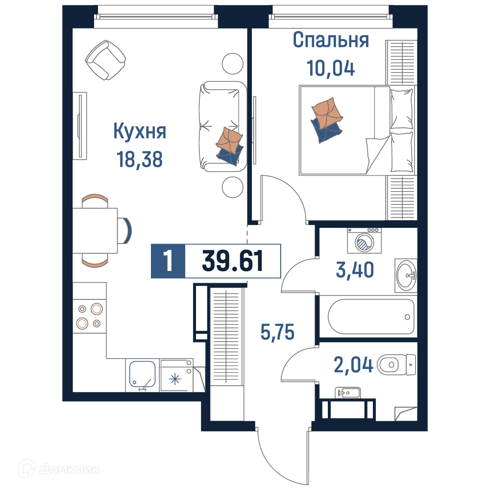 - Общая площадь: 39.61 м²