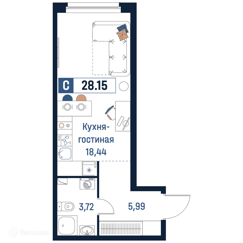 - Общая площадь: 28.15 м²