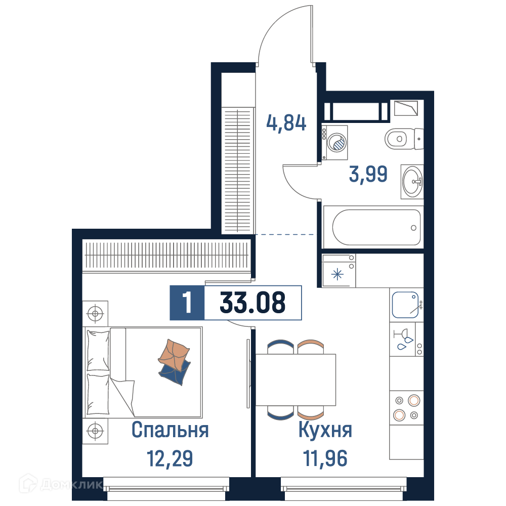 - Общая площадь: 33.08 м²